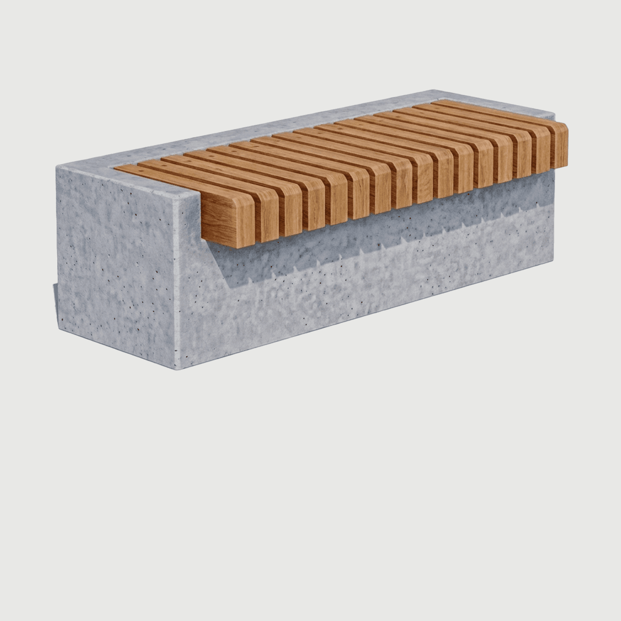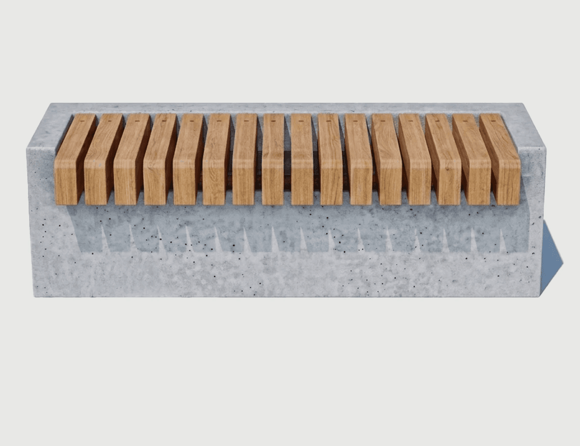 El banco de estar es una pieza de hormigón armado con dimensiones compactas, ideales para el espacio público. El asiento esta compuesto de tirantes de madera que le brindan calidez a los usuarios. TERMINACIONES LISO PULIDO.